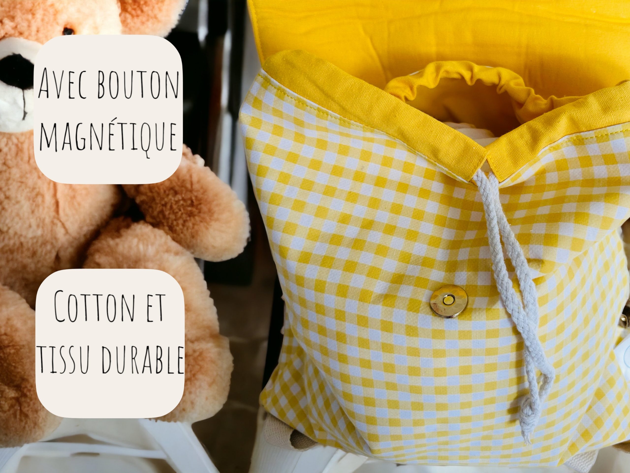 Ce petit sàc à dos il est idéal pour amener à la crèche ou en maternelle. Les dimensions à plat sont de 31,5 cm x 35,5 cm. Le système de fermeture est réalisé par un bouton magnétique et un bouton pour le cordon de serrage. Très pratique pour emmener le goûter , le doudou ou la tenue de change. Un petit cahier tien également facilement à l’intérieur. Le sac à une poignée d’attache très pratique pour le porte manteau et deux brettelles réglables pour s’ajuster parfaitement au dos de l’enfant. Le sac est léger en toile épaisse et coton, confortable et entièrement doublé. Il est préférable de le laver à main. Personnalisation possible avec le prénom de l’enfant. Écrire le prénom et le numéro de la police souhaitée. Exemple: Amélie 3